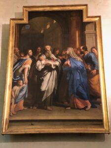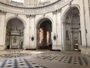 La nef apparaît bien courte en regard de l’ampleur de la rotonde. Mais il faut rappeler que cette dernière servait de lieu de rassemblement aux pèlerins… et, avant son achèvement, de lieu de vente par les artisans d’objets de piété, chapelets et médailles qui étaient exposés sur des étals placés au pied des pilastres ; ensuite les pèlerins gagnaient soit la nef soit l’une ou l’autre des chapelles latérales, symétriques et de taille voisine de celle de la nef.