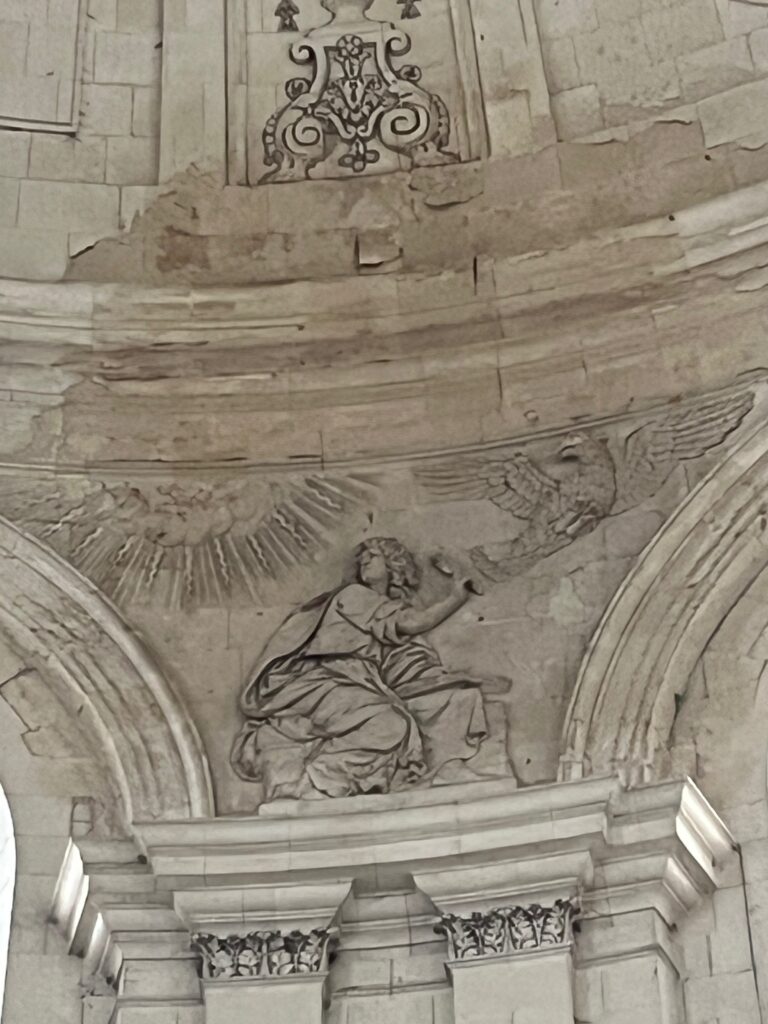 Sous la voûte, elle-même sculptée, entre les baies, se distingue un ensemble de huit bas-reliefs haut perchés ; c’est un des éléments les plus intéressants car son altitude a empêché les destructions durant la Révolution française : les sculptures datent des années 1690 et représentent, avec leurs symboles, les quatre évangélistes, côté oriental et quatre docteurs de l’Église de la fin de l’Antiquité et du Haut Moyen Age côté occidental. Le message théologique est clairement christologique dans cette rotonde tandis que la dévotion mariale apparaît essentielle dans le reste de la chapelle royale. Toute cette partie de la rotonde a échappé aux bombardements allemands de juin 1940 qui entraînèrent l’incendie destructeur de la coupole et du lanternon, finalement reconstruits vers 1948-1953.